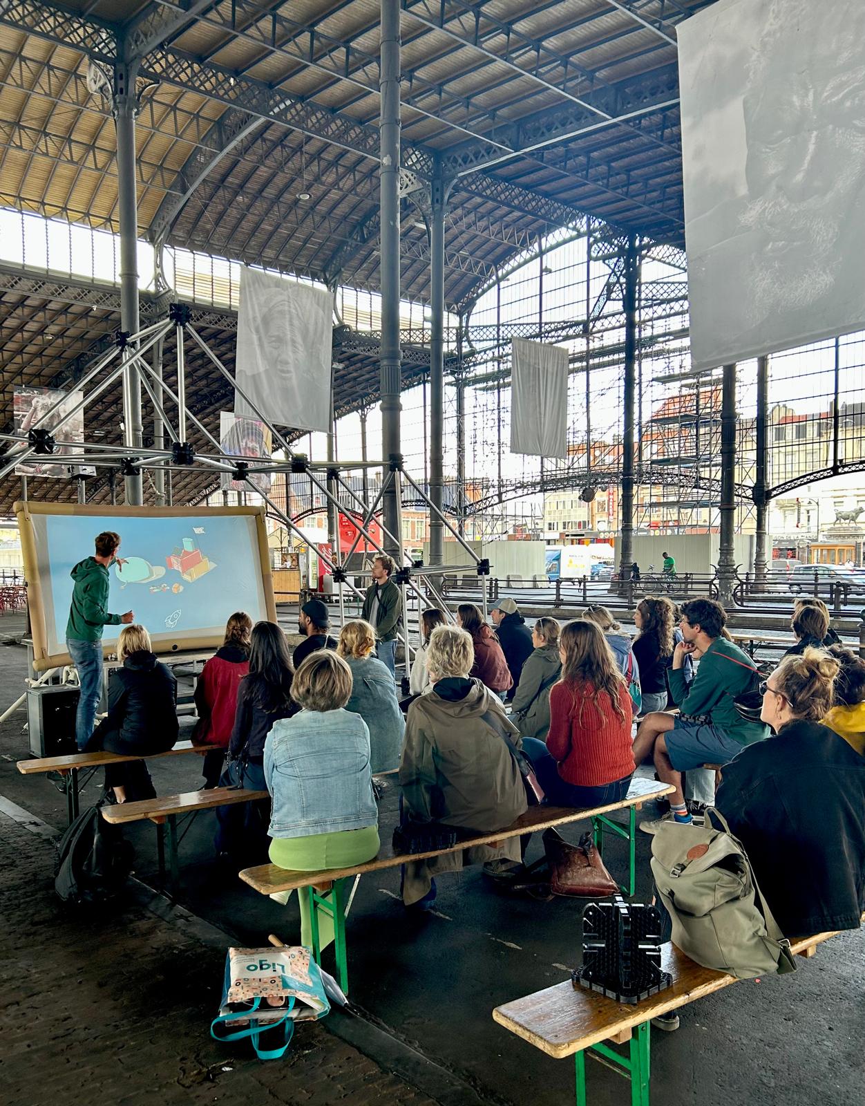 Voor we op pad gingen, gaf Roeland Dudal ons een introductie. Hij is oprichter en partner van Architecture Workroom Brussels (AWB), een cultureel innovatiehuis dat werkt aan de transformatie van onze sociale en fysieke leefomgeving. AWB begeleidde het proces rond de Broedplekken en bundelde inzichten in de publicatie ‘Broedplekken voor Brussel. Sociaal-ruimtelijke bouwstenen voor maatschappelijke infrastructuur’.